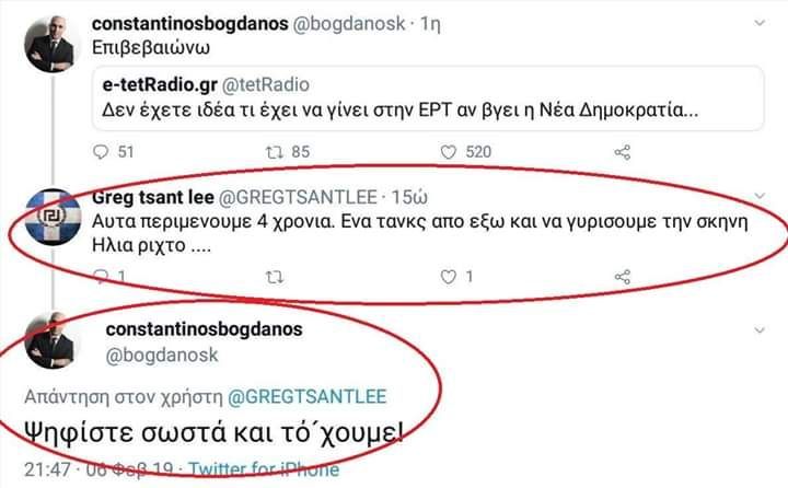 Όλα ξεκίνησαν όταν το e-tetradio.gr έκανε ένα tweet που απλά έγραφε «Δεν έχετε ιδέα τι έχει να γίνει στην ΕΡΤ αν βγει η Νέα Δημοκρατία» με τον πρώην δημοσιογράφο του ΣΚΑΪ να απαντάει ότι επιβεβαιώνει. Στην συζήτηση παρενέβη ένα προφίλ με φωτογραφία της Χρυσής Αυγής, με τον χρήστη να προκρίνει είσοδο των τανκς στη δημόσια τηλεόραση και θυμάται τη γνωστή σκηνή «Ηλία ρίχ’ το» από την ταινία «Όλα είναι δρόμος».